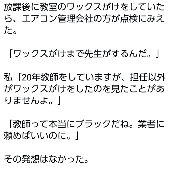 この投稿の中にもあるように、エアコンの点検修理は業者に任せるし、たとえば校舎にヒビが入っていたら、やっぱり業者に任せるでしょ? じゃあ、床のワックスがけだって業者に任せたほうが、きっときれいにやってくれるじゃん。