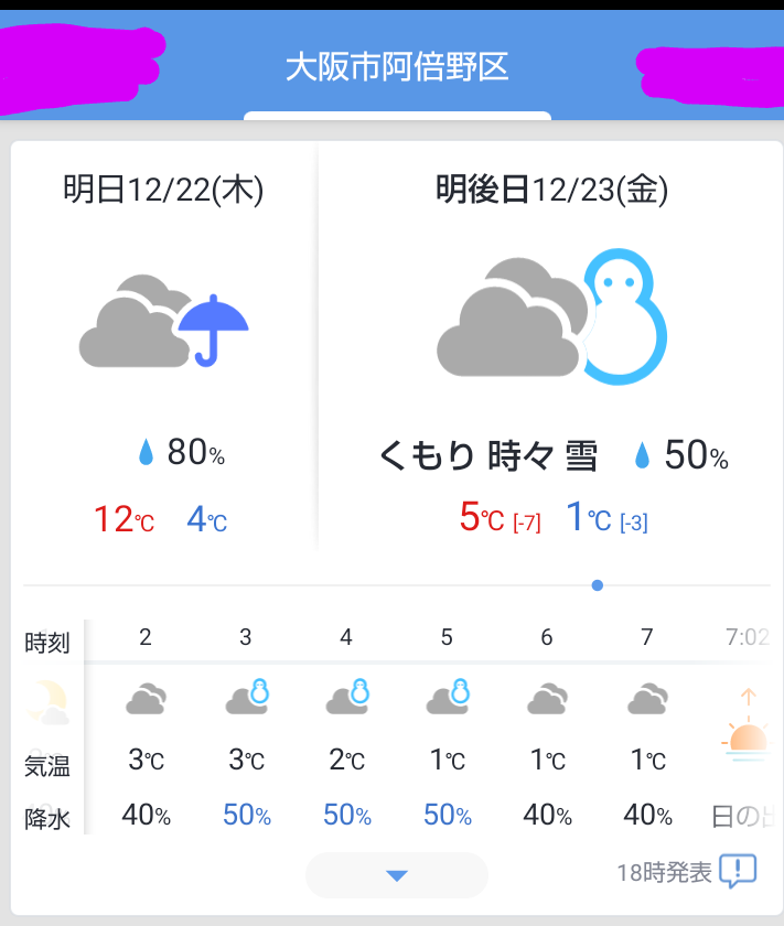 1シーズンあたり何回雪が降るかな? ぐらいの大阪なので、たとえ確率は半々(50%)でも、天気予報の段階で雪だるまが登場すると、ついつい興奮しちゃうようです。