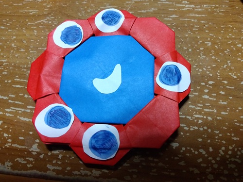 よぉく見ると、あれ? これ、作ったことのあるあの形? と思われた方もいらっしゃるかもしれません。でもそれだと、顔が紅白になる(赤いところと白いところができてしまう)ので、赤い折り紙を、裏返しても赤になるように2枚を張り合わせました。ので、折っていて少しゴワゴワしたところだけ、苦労しました。両面折り紙でどちらも赤というのがあればいいんですけど、そうでなかったら、色画用紙でもよさそう。